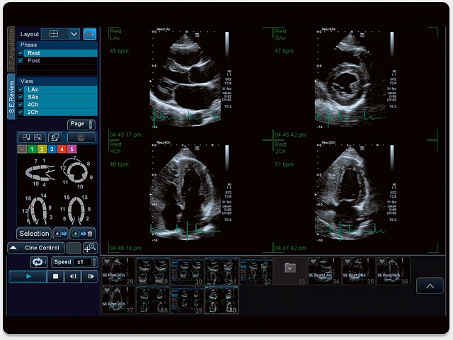 • Stress Echo обеспечивает точную оценку движения стенок, поддерживает как стандартные, так и определяемые пользователем протоколы для физических нагрузок и фармакологических исследований стресса;