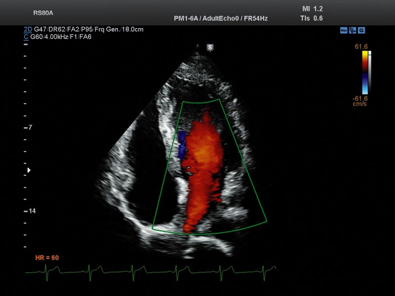 • CD-режим (ЦДК): измерение радиуса ПФСМР (PISA), полуколичественная оценка трансмитрального, транстрикуспидального, трансаортального и транспульмонального кровотока (оценка регургитации), оценка аномальных сбросов крови через МПП И МЖП.