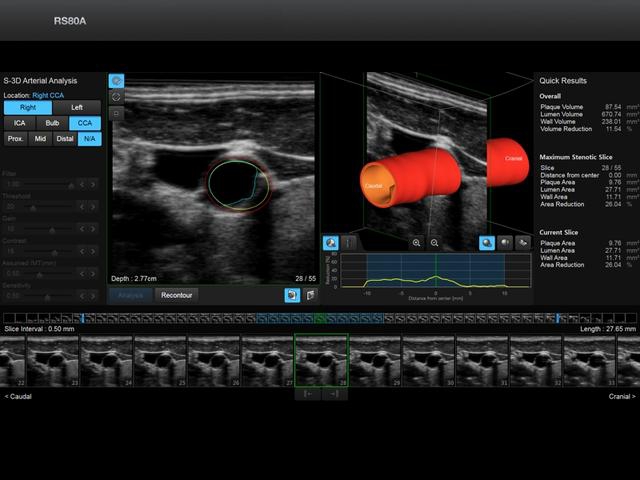 • Модуль S-3D Arterial Analysis - программа позволяющая провести автоматические измерения толщины стенки сонной артерии в объеме с последующей обработкой и различными режимами визуализации.