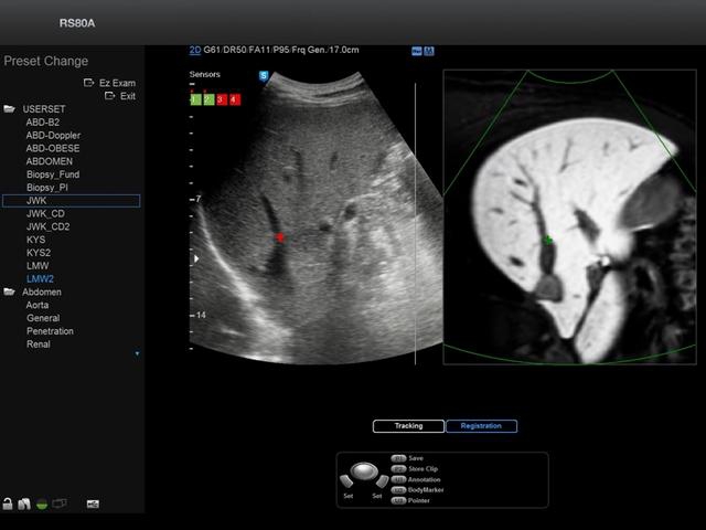• Модуль S-Fusion - программа, позволяющая одновременную визуализацию участков печени, полученную при помощи ультразвукового исследования и данные КТ или МРТ автоматически на одном экране и в разных режимах (в том числе в режиме реального времени) с помощью специальных магнитных сенсоров на датчике.