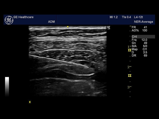 • B Steer + Needle Recognition - режим B-сканирования с отклонением угла (для линейных датчиков) и улучшеным распознаванием биопсийной иглы. Поддерживается датчиками 9L-RS, 12L-RS, L4-12t-RS, L8-18i-RS, L10-22-RS